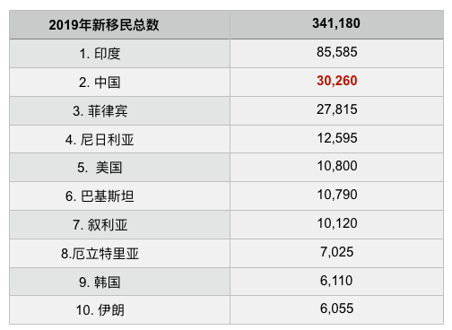 印度仍然是加拿大新移民的主要來源國。2019年印度人占加拿大所有新移民的25%。中國位居第二,占新移民的9%,其次是菲律賓,占新移民的8%。