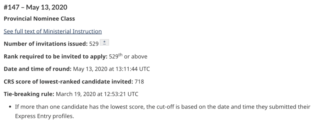 5月13日和5月14日,移民局再次進行了兩輪指定項目抽選,分別向529名省提名(Express Entry-aligned PNP streams)申請人和3371名加拿大經驗類(Canadian Experience Class, 簡稱CEC)申請人發放了移民邀請信(ITAs),抽選分數分別是718分和447分。