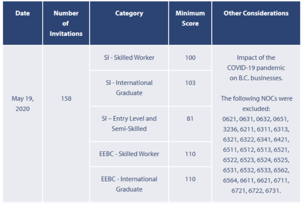 5月19日,BC省省提名項目進行了新一輪邀請,餐飲,酒店及其他服務類行業依舊暫停抽取,此次分數較5月7日的抽取有所下降,抽取人數僅為158人。具體抽分情況如下: