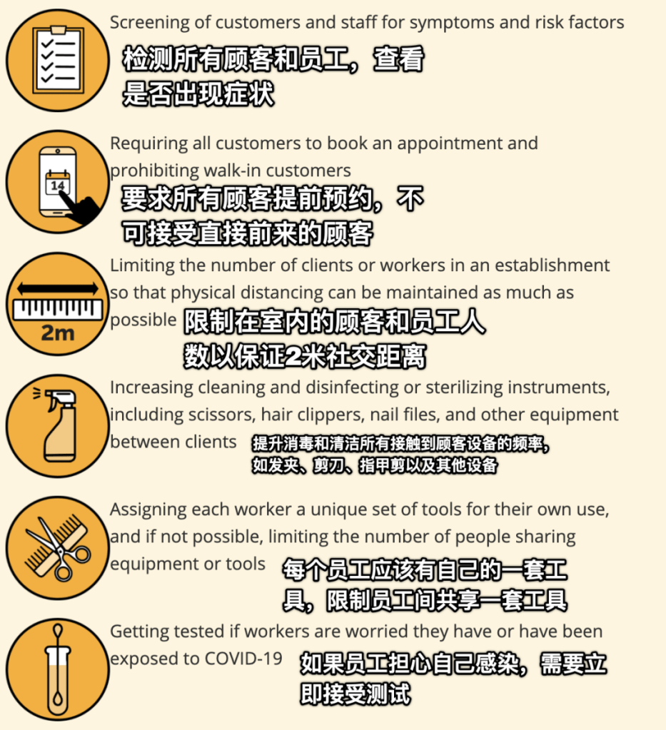 - 個人護理服務必須採取措施,最大限度的保證顧客之間的物理距離,例如限制員工和顧客人數。