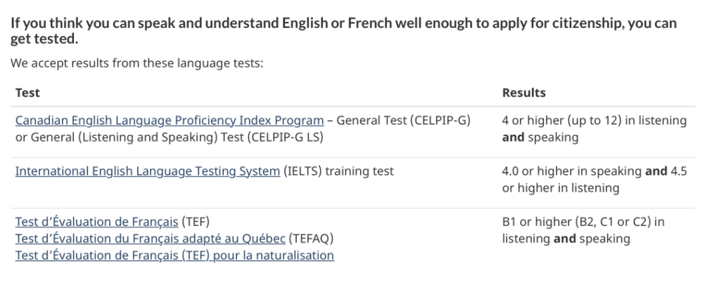 移民局發佈的公民入籍考試語言要求(英語或法語)公民考試要求的英語CLB4級,相當於雅思G類口語至少4分,聽力至少4.5分,或思培口語聽力均達到4分以上 。