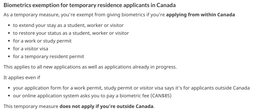 重大利好!加拿大移民局近日更新:目前在加拿大境內的臨時簽證申請人將豁免生物特徵辨識資料。豁免同樣適用於已經遞交等待審理的申請。