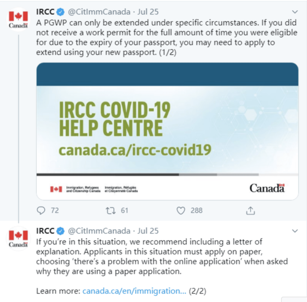 1. 開放式畢業工簽(PGWP)只在非常特定的情況下才可以續簽延期。如果您是由於護照過期,畢業工簽沒有簽滿3年,您需要用換發好的新護照來延期您的畢業工簽,以便得到累計三年的工簽時長。
