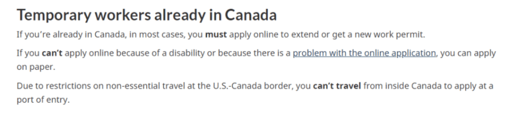 同時提醒大家,受到美加邊境旅遊禁令的影響,移民局不建議申請人從加拿大境內前往美加邊境(port of entry)換取工簽。