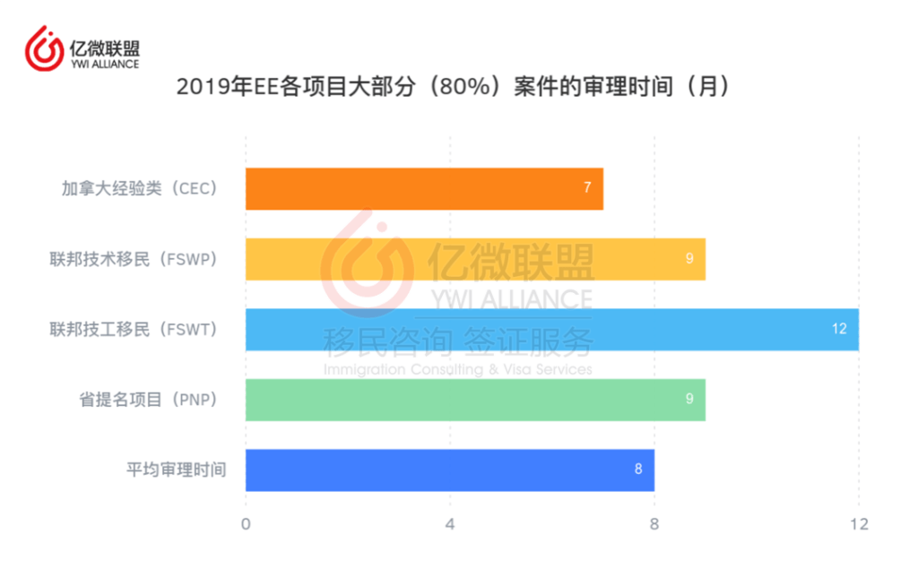 移民局公示了2019年處理EE系統內各專案,包括加拿大經驗類(CEC)、聯邦技術移民專案(FSWP)、省提名專案(PNP)和聯邦技工移民專案(FSWT),80%的申請所需的受理時間。