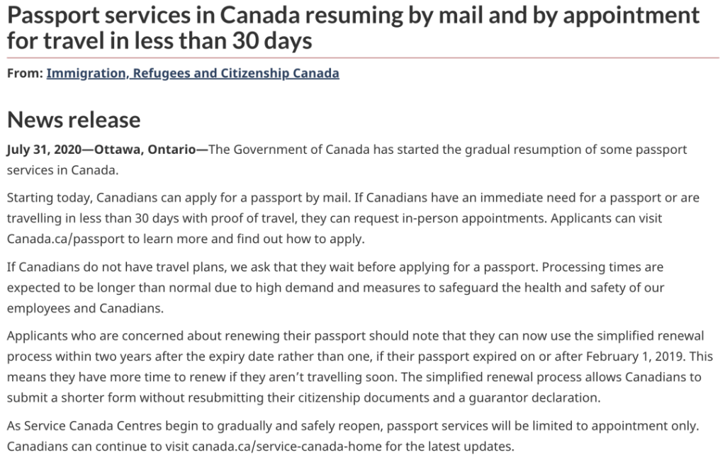 從7月31日開始,加拿大公民可以通過紙質郵件(Mail)來申辦護照。若是有特殊的緊急需求,希望在30天之內獲得護照,可要求預約親自前往申辦(In-person Appointment)。