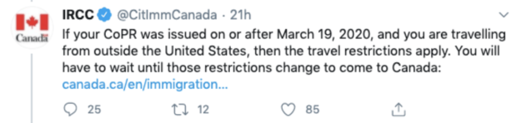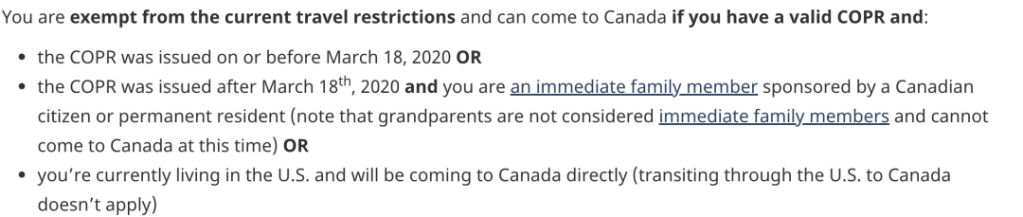– 如果您的登陸紙(CoPR)是在2020年3月18日之後獲批,出發地為美國,也可以從美國前往加拿大定居並免於旅行限制。