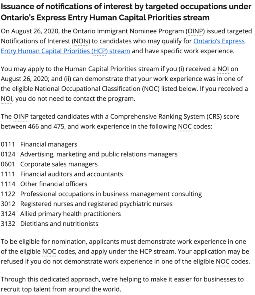 安省移民廳針對CRS分數在466-475分之間,並且有相關職業工作經驗的候選人,發放了這些邀請。
