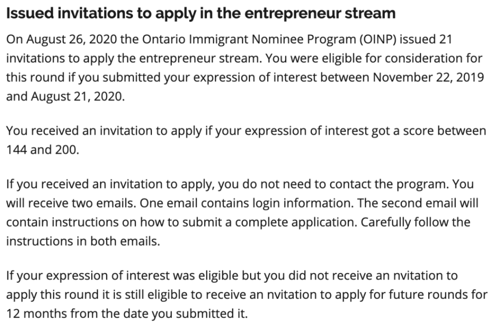 8月26日,安省移民廳還針對分數在144到200分之間的21位安省企業家移民申請人(Entrepreneur Stream)發出了省提名邀請函。