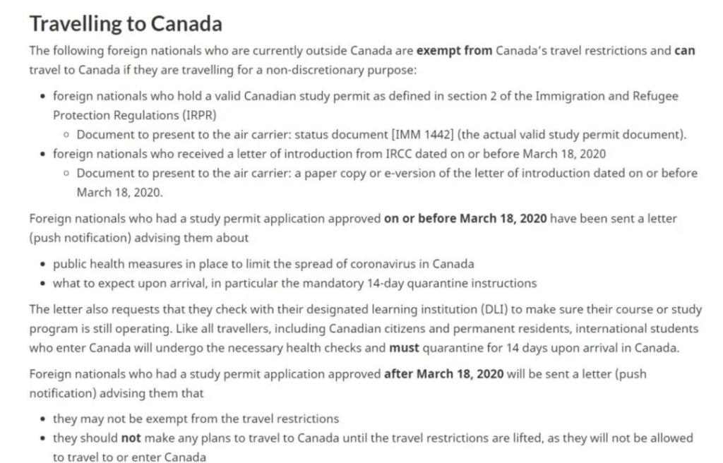 – 在3月18日前獲批學簽的外國公民(需要給航空公司出示紙質的加拿大有效學簽),他們會收到加拿大政府的相關疫情通知書和強制的14天隔離指導。同時,他們需要保證自己的學校(DLI)與學簽所述一致,課程正常運行,且入境加拿大後將必須接受必要的健康檢查。