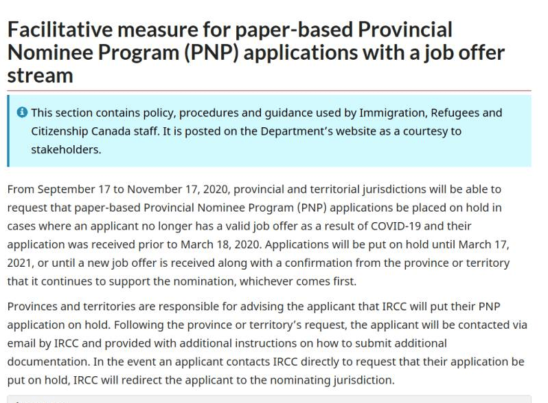 2020年9月17日移民局新政,即日起到2020年11月17日,各省和地區移民廳將會暫停審理部分PNP省提名紙質申請。