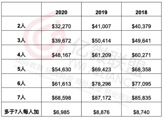 參照下表,如果2020年被抽中,正式遞交申請時(2021年),收入需要滿足連續三年報稅收入達到如下要求:2020年$68,598,2019年$87,172,2018年$85,835。七人以上,每增加一人,按照移民局公佈的要求相應增加,請參照下表。