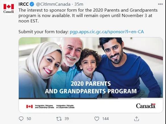 父母祖父母團聚移民(PGP)從加拿大東部時間(EST)10月13日(今天)中午12點起,正式開放接受意願表達申請,將持續3周,至11月3日中午12點截止。