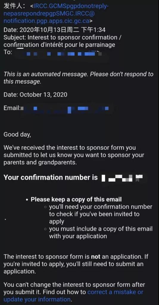更新電子郵件:將新的電子郵件發送到IRCC.PGP.CORRECTION-CORRECTION.PGP.IRCC@cic.gc.ca。並包括以下內容:確認號碼、擔保人全名、出生日期、出生國家。定期檢查舊的電子郵件收件箱,直到移民局更新完畢。