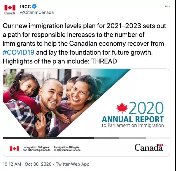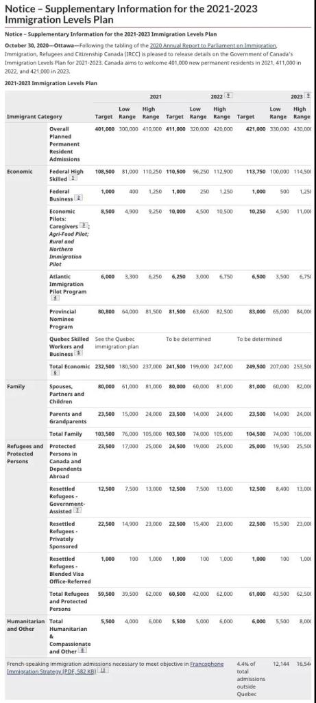 2020年10月30日,加拿大移民部部長Marco Mendicino宣佈了2021-2023年的最新三年移民計畫。