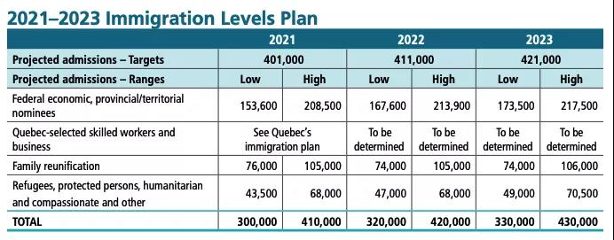 1. 加拿大每年計畫接收總人口1%的新移民,2021計畫接收40.1萬新移民,2022年計畫接收41.1萬新移民,2023年計畫接收42.1萬新移民,三年一共接收約123萬。
