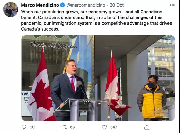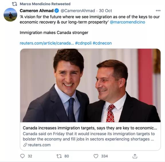 現任移民部長Marco Mendicino在推特上也多次為移民給加拿大帶來的好處背書。”