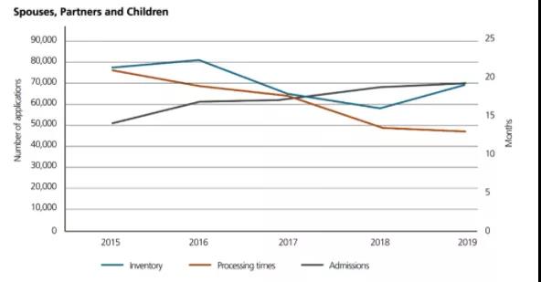 報告指出,2015年底,加拿大積壓了7.7萬份配偶和子女類別下的申請,處理時間為21個月。到2019年底,這一數位降至13個月。