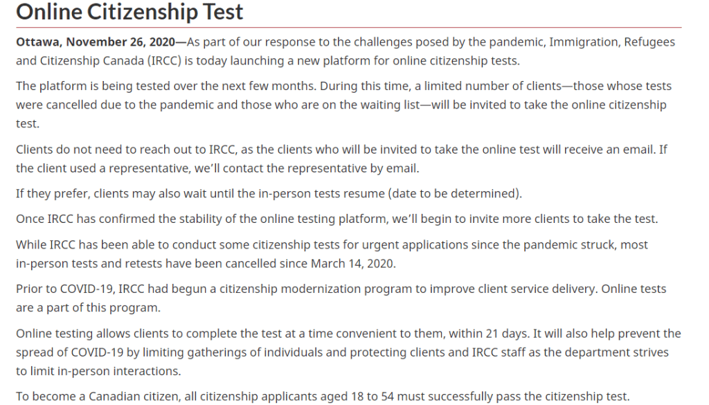 2020年11月26日,加拿大移民局Immigration, Refugees and Citizenship Canada (IRCC) 啟動了一個線上公民入籍考試的新平臺。該平臺將在接下來通過郵件邀請數量有限的申請人接受線上公民入籍考試。申請人無需主動聯繫IRCC。