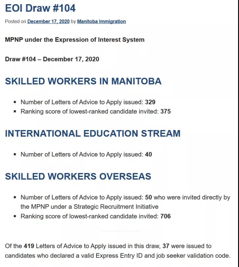 過去一個月,曼省入池的小夥伴都有些人心惶惶,即使疫情期間也雷打不動的兩週一抽分的頻率,在歲末出乎意料地被打斷~本週四省提名辦公室MPNP終於不負眾望進行了第104次抽分,不僅再現歷史最低分,本輪375分即可被邀請!同時抽取人數創2020年最高紀錄:329人!