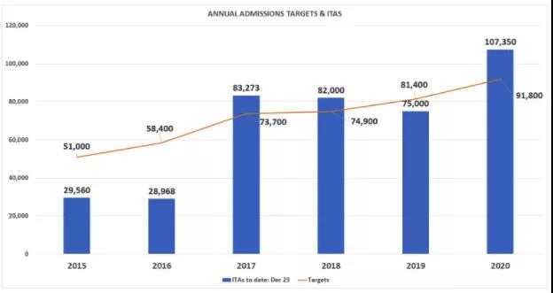 截止台灣時間12月31日為止,2020年,加拿大移民局向候選人發出了共計10萬7350份邀請函(ITAs),遠超今年目標人數91800。