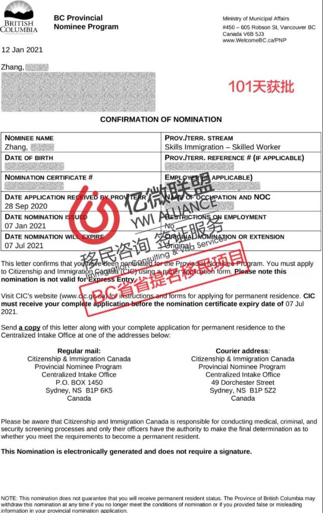 向大家分享最近一個101天快速獲批的BC省提名成功案例:
