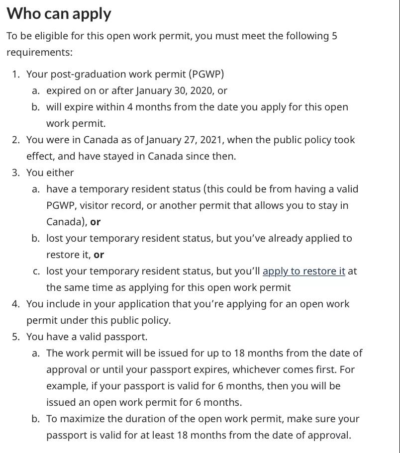 1. 畢業工簽(PGWP)已在2020年1月30日當天或之後過期,或將在申請日起4個月內到期;
