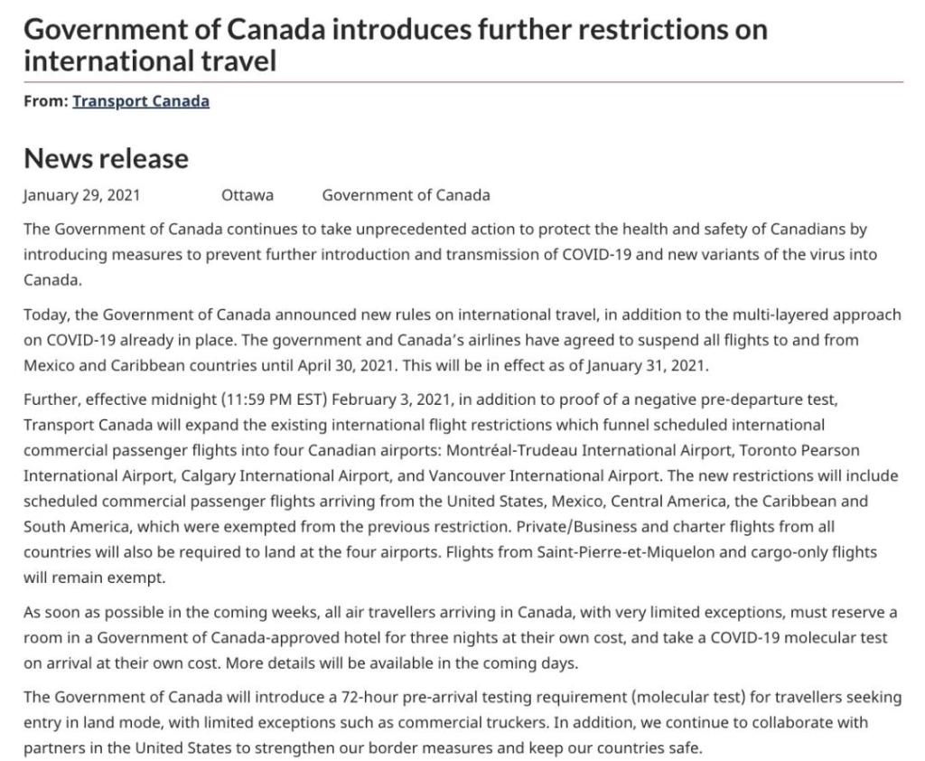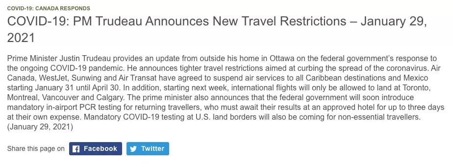 為了避免民眾非必要的出國度假旅行,加拿大航空、西捷航空、太陽之翼航空和泛亞航空(Air Canada, WestJet, Sunwing, Air Transat)從1月31日至4月30日期間,暫停所有飛往加勒比海以及墨西哥等以度假為目的地的航班。