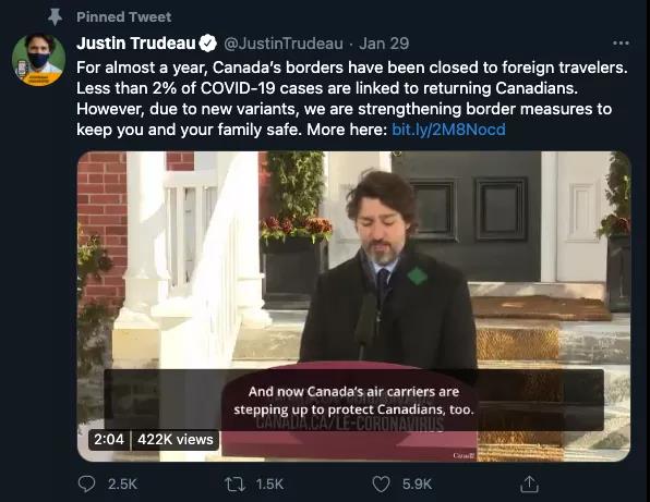 特魯多還指出,研究顯示,加拿大的COVID-19病例中只有2%是由於入境旅客造成的,這證明了旅行限制的有效性。