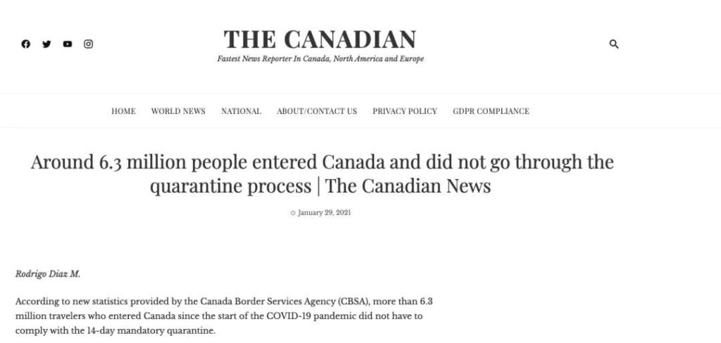 1月28日,加拿大邊境服務局(CBSA)公佈最新統計資料,自新冠疫情爆發以來,有超過630萬進入加拿大的國際旅客沒有完成強制性的14天隔離。