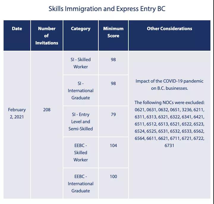 BCPNP 技術移民專案 – 2021年2月2日最新邀請分數:
