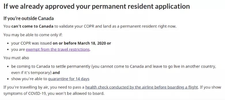 截至2021年3月5日,依據官網資料,只有在2020年3月18日當天或之前獲批永久居民身份,並收到移民紙(Confirmation of Permanent Residence, 簡稱COPR)的申請人,才可以豁免登陸加拿大。