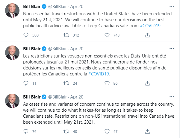 加拿大已將除美國外的國際旅行封鎖令延長至2021年5月21日。