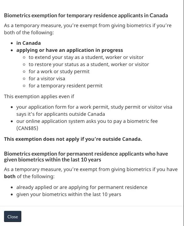 根據加拿大移民局官網訊息:目前在加拿大境內的幾類臨時簽證及永久居民身份申請人將豁免生物採集 (biometrics)。