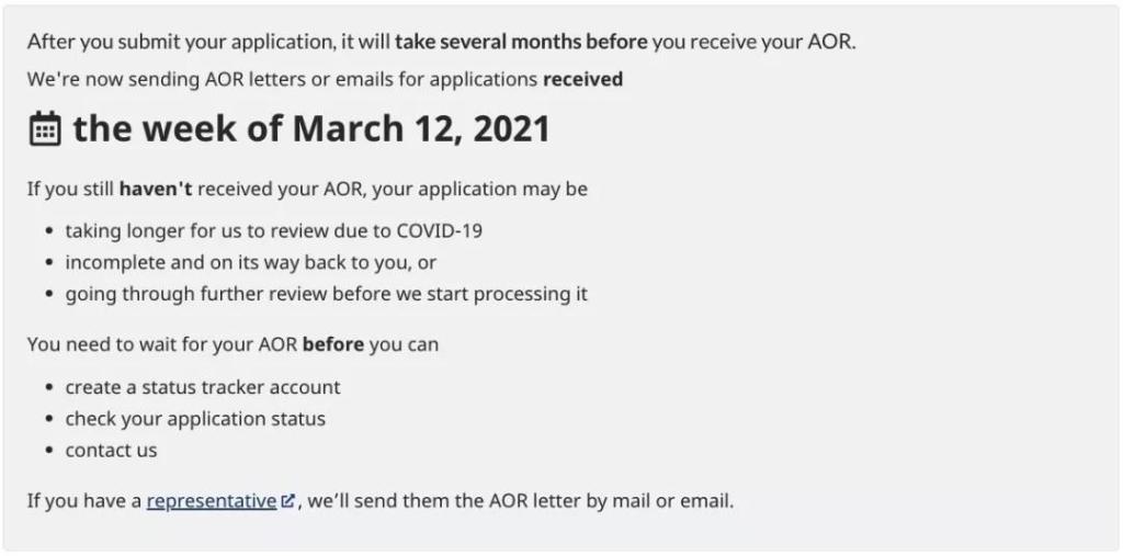 目前,加拿大移民局官網顯示,當前正在發放2021年3月12日當周收到申請的確認信(AOR)。