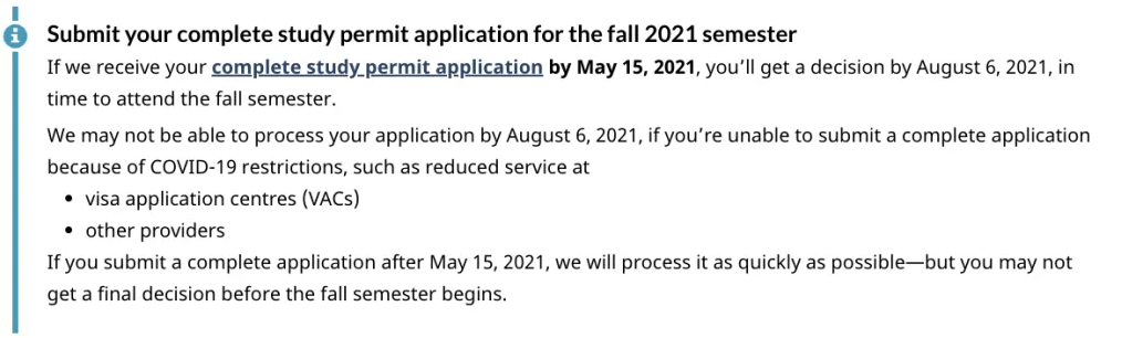 在2021年5月15日前收到完整的學習許可申請,將在2021年8月6日前收到申請結果。在2021年5月15日之後遞交的申請,移民局承諾將盡快受理,但不能保證秋季入學前能夠給出明確答覆。