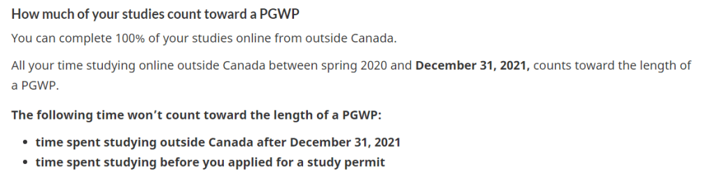 - 在加拿大境外100%的在線課程學習。此項政策只適用於2020年春季到2021年12月31日之間,並於網客前遞交學習許可申請的學生。