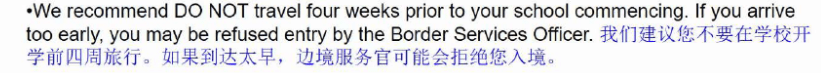 移民局建議學生不早於開學前四週入境加拿大。如果到達太早,邊境官員可能會拒絕入境。