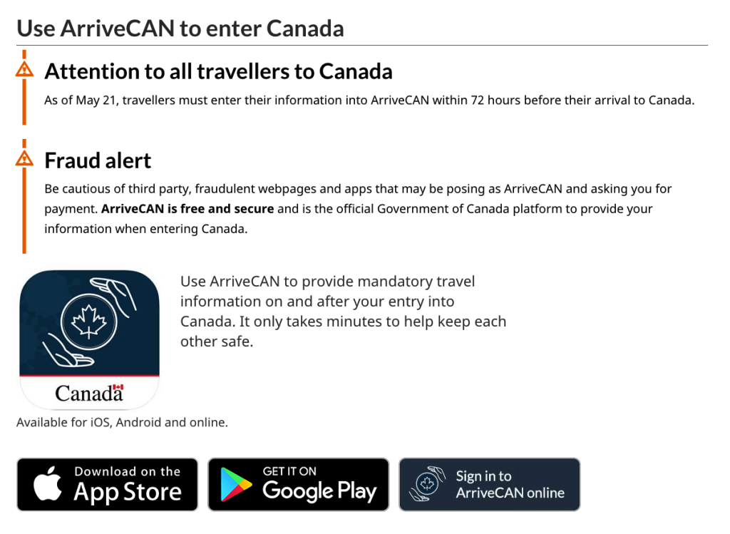旅客還必須在抵達加拿大之前,通過ArriveCAN應用程式,或通過Canada.ca/ArriveCAN線上登錄提供個人資訊。
