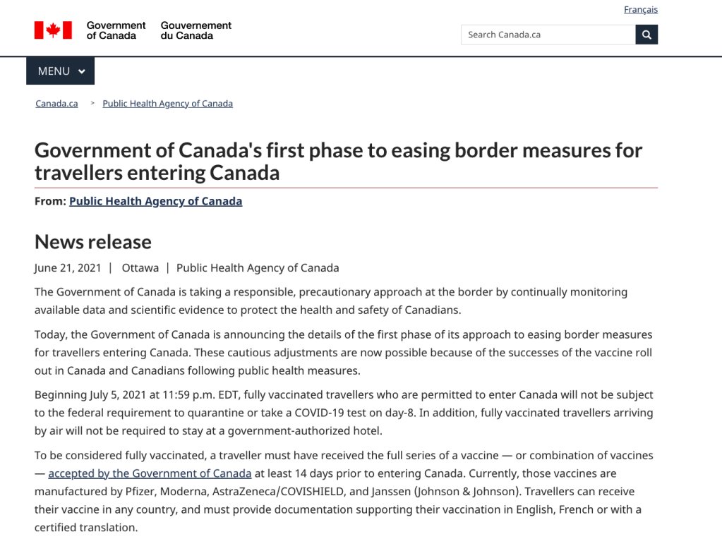 2021年7月5日東部時間晚上11點59分起,完全接種疫苗的加拿大公民、永久居民、以及獲批等待登陸的新移民,將不需要進行14天隔離或在第8天進行核酸檢測。