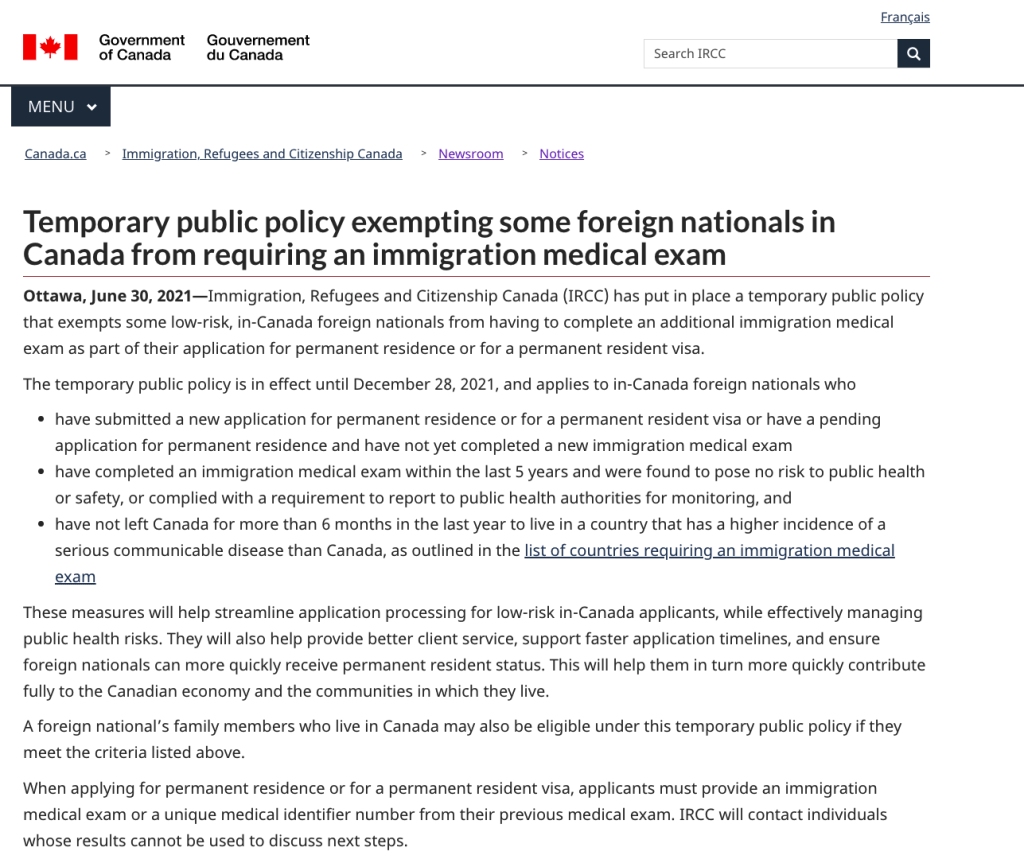 作為一項臨時政策,加拿大移民局將豁免部份加拿大境內移民申請人的移民體檢!即日起生效,直到2021年12月28日!