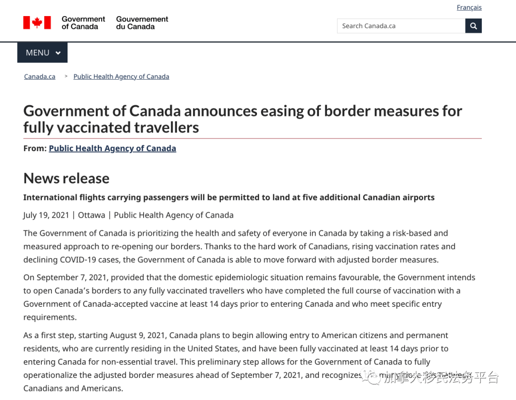 若疫情及疫苗接種情況持續好轉, 9月7日加拿大聯邦政府將開放加拿大邊境,允許來自任何國家的完全接種疫苗旅客入境加拿大自由旅行,且無需隔離。