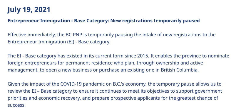 加拿大BC省時間2021年7月19日,BC省省提名辦公室宣布暫停接受企業家移民-基礎類(Entrepreneur Immigration – Base category)的申請,即日生效。