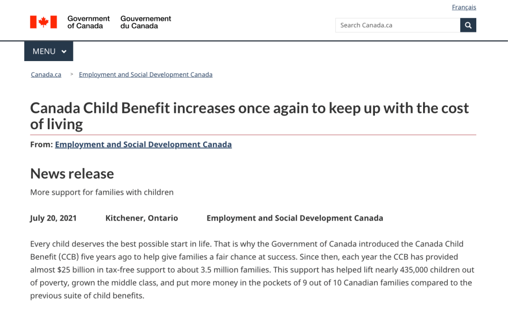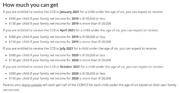 2021年,根據家庭收入不同,每名六歲以下的兒童一年最多可獲得$6833加幣,每名6-17歲兒童最多可獲得$5765加幣一年。