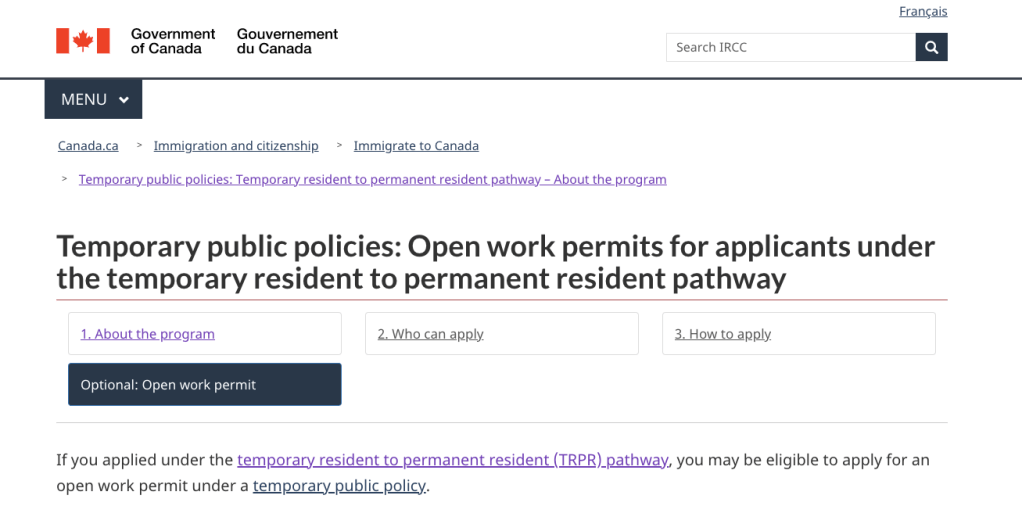 官方申請網址:https://www.canada.ca/en/immigration-refugees-citizenship/services/immigrate-canada/tr-pr-pathway/open-work-permit.html
