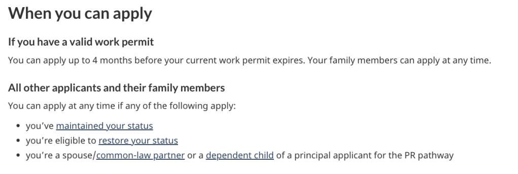 - 遞交開放工簽申請時擁有合法的加拿大臨時居民身份、在目前持有的簽證到期前已經申請延長(maintained status),或有資格恢復身份(restoration)