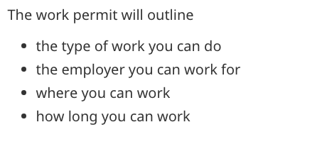 獲批的工簽上會標明可以工作的類別、雇主、地點和期限。部分申请人可能可以取得不限定雇主、不限制工作種類的開放工簽。