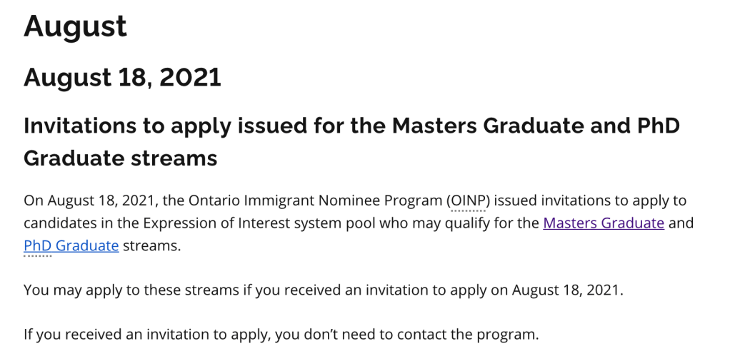 加拿大時間2021年8月18日,安省省提名辦公室(OINP)針對碩士及博士畢業生候選人進行了一輪抽選。
