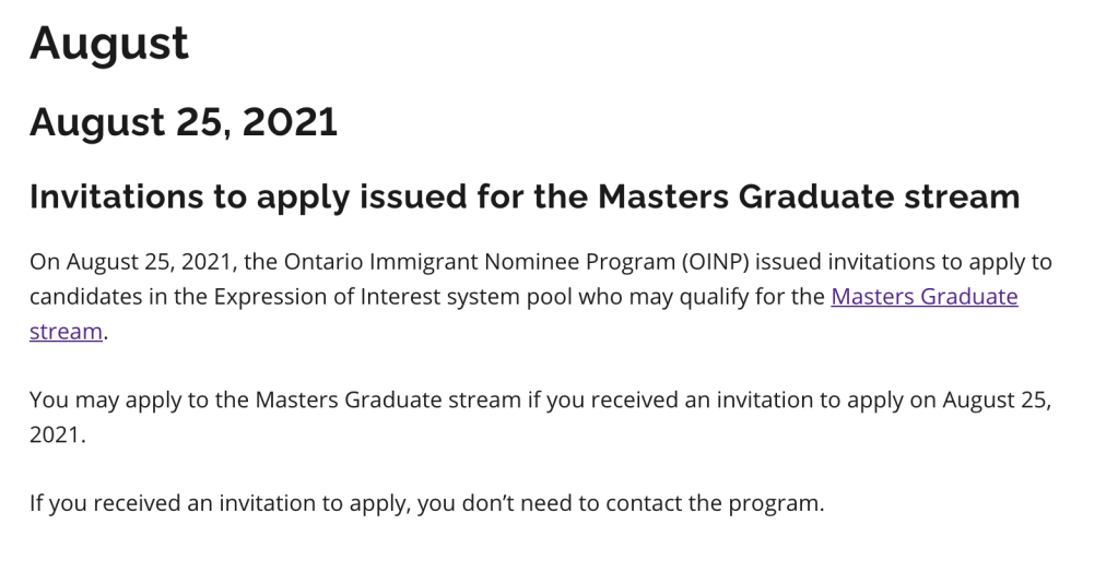 加拿大時間2021年8月25日,安省省提名辦公室(OINP)針對碩士畢業生候選人進行了一輪抽選,抽選分37分。