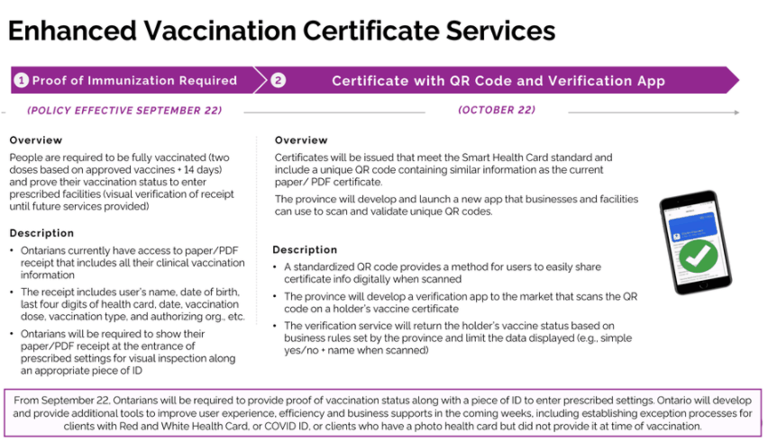 安省政府為了進一步控制疫情,鼓勵每位安省居民接種疫苗,針對不能始終配戴口罩的高風險室內場所,推出了此項疫苗證明政策,將分為兩階段推進。